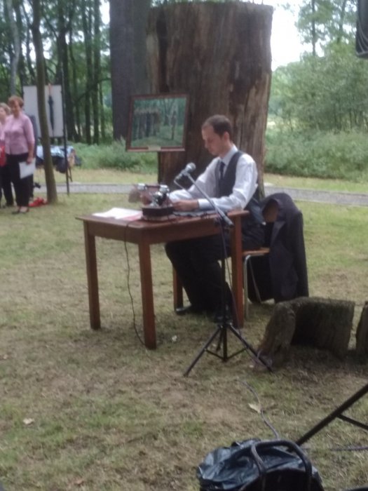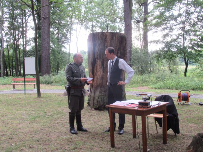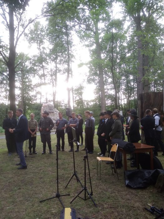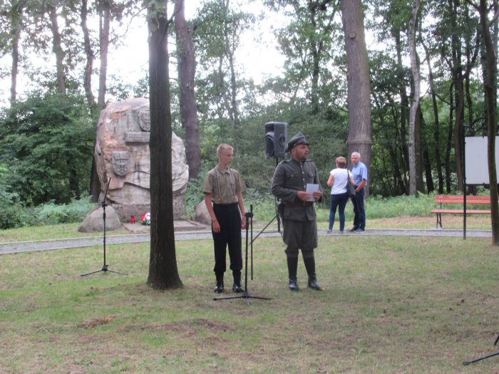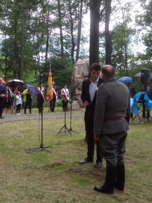 Podczas uroczystości wystąpił chór „Lutnia”, w którego szeregach śpiewało wielu powstańców śląskich, w tym komendant Aleksy Fizia. Gościem szczególnym był prawie stuletni sztandar powstańczy, wyjątkowo udostępniony na tę niezwykłą chwilę, którego strzegli harcerze. W miejscu pnia po jednym z dębów pamiętających zbiórkę powstańczą nasze stowarzyszenie umieściło obraz Jarosława Misiaka „„Pierwsze powstanie śląskie”. Częściowo członkowie naszego stowarzyszenia a przede wszystkim młodzież wraz ze „swoim dowódcą” nauczycielem Panem Michałem Pudełko oraz narratorem i reżyserem scenek powstańczych Panem Stanisławem Janoszem z naszego stowarzyszenia odtworzyli dwie scenki – jedna to podjęcie decyzji przez komendanta Fizię o rozpoczęciu powstania w powiecie pszczyńskim a druga to kulminacyjny moment – przysięga powstańcza. Młodzież zagrała swoje role perfekcyjnie. Na koniec bractwo kurkowe oddało salwę honorową ku czci powstańców. Nasze stowarzyszenie przygotowało projekt „Pszczyńskiego Kuryera Powstańczego” i 12 kartek z opisem najważniejszych osób, instytucji i przedmiotów związanych z I powstaniem śląskim. Ceremonię prowadziła Dyrektor Biblioteki Publicznej w Pszczynie Pani Teresa Musik. Gośćmi honorowymi byli potomkowie powstańców pszczyńskich. Chwała bohaterom sprzed stu lat.