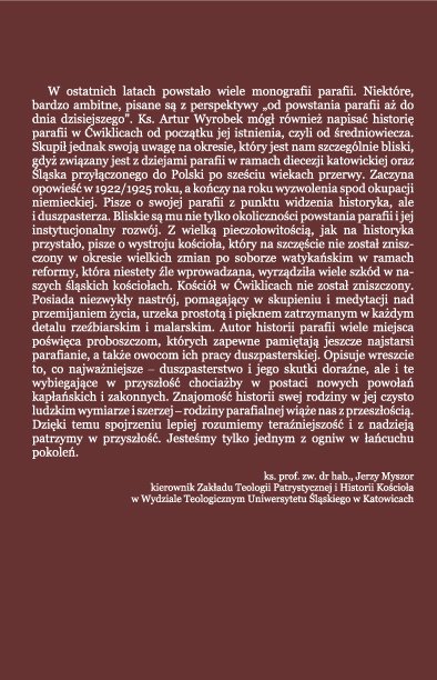 W ostatnich latach powstało wiele monografii parafii. Niektóre, bardzo ambitne, pisane są z perspektywy „od powstania parafii aż do dnia dzisiejszego”. Ks. Artur Wyrobek mógł również napisać historię parafii w Ćwiklicach od początku jej istnienia, czyli od średniowiecza. Skupił jednak swoją uwagę na okresie, który jest nam szczególnie bliski, gdyż Związany jest z dziejami parafii w ramach diecezji katowickiej oraz Śląska przyłączonego do Polski po sześciu wiekach przerwy. Zaczyna opowieść w 1922/1925 roku, a kończy na roku wyzwolenia spod okupacji niemieckiej. Pisze o swojej parafii z punktu widzenia historyka, ale i duszpasterza. Bliskie są mu nie tylko okoliczności powstania parafii jej instytucjonalny rozwój. Z wielką pieczołowitością, jak na historyka przystało, pisze o wystroju kościoła, który na szczęście nie został zniszczony w okresie wielkich zmian po soborze watykańskim w ramach reformy, która niestety źle wprowadzana, wyrządziła wiele szkód w naszych śląskich kościołach. Kościół w Ćwiklicach nie został zniszczony. Posiada niezwykły nastrój, pomagający w skupieniu i medytacji nad przemijaniem życia, urzeka prostotą i pięknem zatrzymanym w każdym detalu rzeźbiarskim i malarskim. Autor historii parafii wiele miejsca poświęca proboszczom, których zapewne pamiętają jeszcze najstarsi parafianie, a także owocom ich pracy duszpasterskiej. Opisuje wreszcie to, co najważniejsze – duszpasterstwo i jego skutki doraźne, ale i te wybiegające w przyszłość chociażby w postaci nowych powołań kapłańskich i zakonnych. Znajomość historii swej rodziny w jej czysto ludzkim wymiarze i szerzej – rodziny parafialnej wiąże naszą przeszłością. Dzięki temu spojrzeniu lepiej rozumiemy teraźniejszość i z nadzieją patrzymy w przyszłość. Jesteśmy tylko jednym z ogniw w łańcuchu pokoleń.