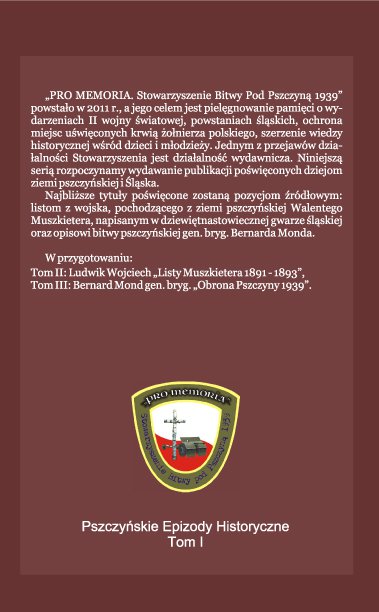 „PROMEMORIA. Stowarzyszenie Bitwy Pod Pszczyną 1939” powstało w 2011 r., a jego celem jest pielęgnowanie pamięci o wydarzeniach I wojny światowej, powstaniach śląskich, ochrona miejsc uświęconych krwią żołnierza polskiego, szerzenie wiedzy historycznej wśród dzieci i młodzieży. Jednym z przejawów działalności Stowarzyszenia jest działalność wydawnicza. Niniejszą serią rozpoczynamy wydawanie publikacji poświęconych dziejom ziemi pszczyńskiej i Śląska. Najbliższe tytuły poświęcone zostaną pozycjom źródłowym: listom z wojska, pochodzącego z ziemi pszczyńskiej Walentego Muszkietera, napisanym w dziewiętnastowiecznej gwarze śląskiej oraz opisowi bitwy pszczyńskiej gen. bryg. Bernarda Monda.