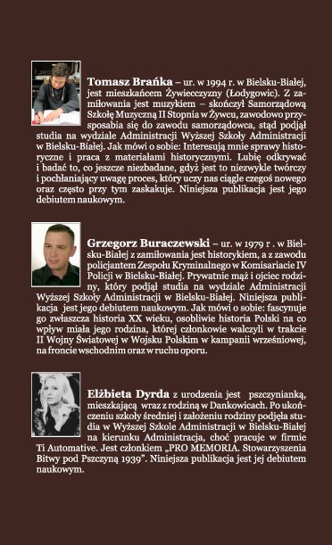 Grzegorz Buraczewski – ur. w 1979 r. w Bielsku-Białej z zamiłowania jest historykiem, a z zawodu policjantem Zespołu Kryminalnego w Komisariacie IV Policji w Bielsku-Białej. Prywatnie mąż i ojciec rodziny, który podjął studia na Wydziale Administracji Wyższej Szkoły Administracji w Bielsku-Białej. Niniejsza publikacja jest jego debiutem naukowym. Jak mówi o sobie: fascynuje go zwłaszcza historia XX wieku, osobliwie historia Polski na co wpływ miała jego rodzina, której członkowie walczyli w trakcie II wojny światowej w Wojsku Polskim w kampanii wrześniowej, na froncie wschodnim oraz w ruchu oporu.