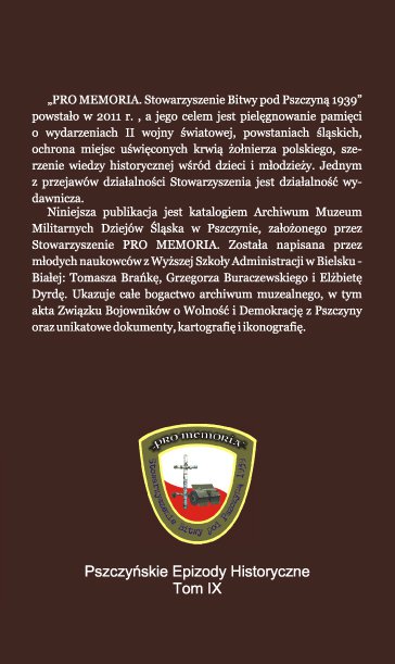 Niniejsza publikacja jest katalogiem Archiwum Muzeum Militarnych Dziejów Śląska w Pszczynie, założonego przez Stowarzyszenie PRO MEMORIA. Została napisana przez młodych naukowców z Wyższej Szkoły Administracji w Bielsku Białej: Tomasza Brańkę, Grzegorza Buraczewskiego i Elżbietę Dyrdę. Ukazuje całe bogactwo archiwum muzealnego, w tym akta Związku Bojowników o Wolność i Demokrację z Pszczyny oraz unikatowe dokumenty, kartografię ikonografię.