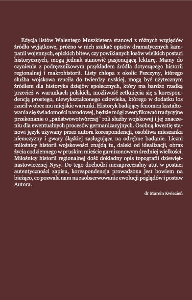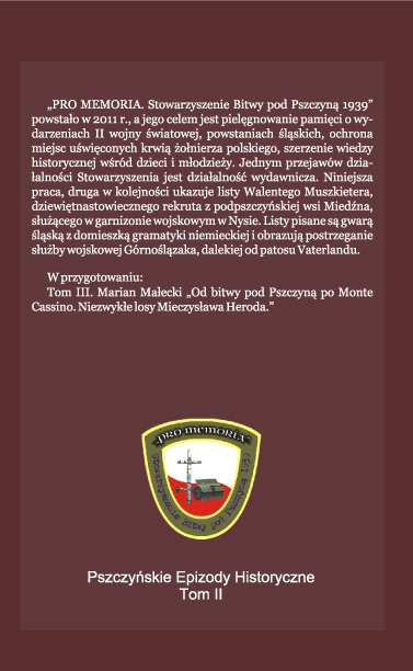 „PRO MEMORIA. Stowarzyszenie Bitwy pod Pszczyną 1939” powstało w 2011 r., a jego celem jest pielęgnowanie pamięci o wydarzeniach II wojny światowej, powstaniach śląskich, ochrona miejsc uświęconych krwią żołnierza polskiego, szerzenie wiedzy historycznej wśród dzieci i młodzieży. Jednym przejawów działalności Stowarzyszenia jest działalność wydawnicza. Niniejsza praca, druga w kolejności ukazuje listy Walentego Muszkietera, dziewiętnastowiecznego rekruta z podpszczyńskiej wsi Miedźna, służącego w garnizonie wojskowym w Nysie. Listy pisane są gwarą śląską z domieszką gramatyki niemieckiej i obrazują postrzeganie służby wojskowej Górnoślązaka, dalekiej od patosu Vaterlandu.