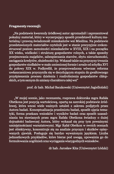 „Na podstawie kwerendy źródłowej autor zgromadził i zaprezentował pokaźny materiał, który w wyczerpujący sposób przedstawił kulturę materialną i prawną świadomość mieszkańców wsi Miedźna. Na podstawie przedstawionych materiałów czytelnik jest w stanie precyzyjnie zrekonstruować poziom zamożności mieszkańców w XVIII, XIX i na początku XX wieku, wielkości i strukturę gospodarstw rolnych, a także sposoby przejmowania majątków, zabezpieczania starców, zbytu nieruchomości, zaciągania kredytów, służebności itp. Wskazał także na przyczyny trwania gospodarstw siodłaków w mało zmienionej formie i areale od schyłku XVI do połowy XIX w.