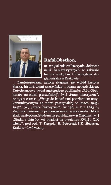 Rafał Obetkon podjął się prześledzenia materiałów archiwalnych w celu ukazania życia ludności wiejskiej, określenia jej zasobności, bogactwa, społecznego rozwarstwienia, sposobów nabywania majątków chłopskich i specyfiki pszczyńskiej w tym zakresie.
