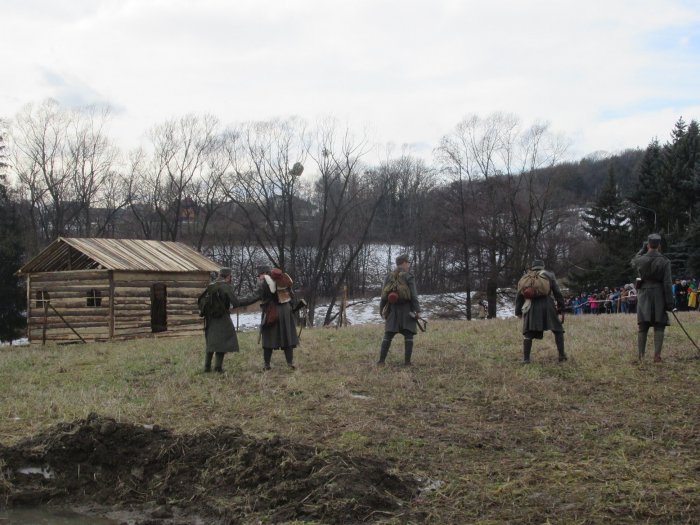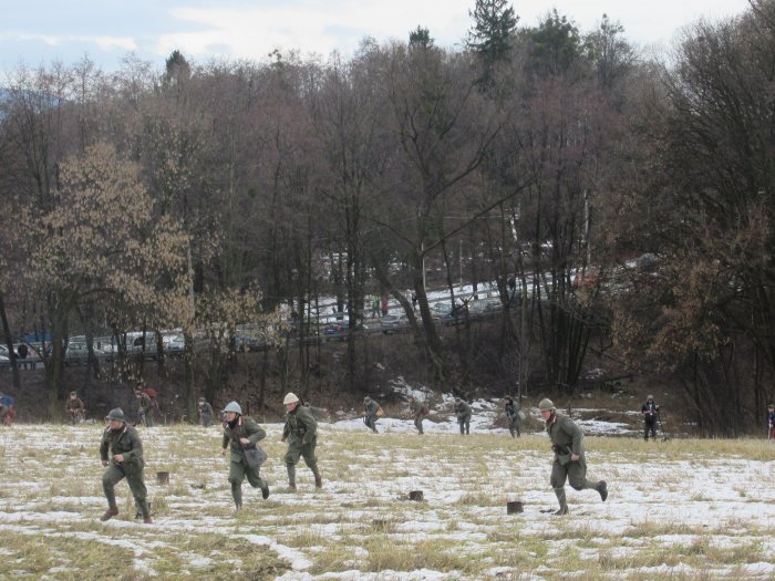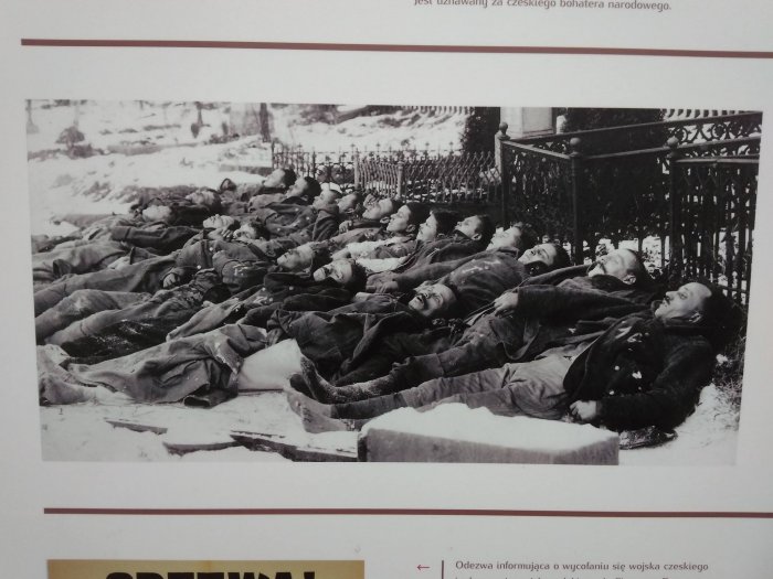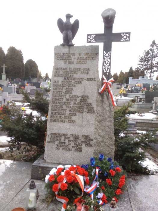 Była to pierwsza dzielnica, która jeszcze przed niepodległością Polski, ogłosiła jej…niepodległość (5 listopada 1918 r.). Uczestniczyliśmy jako stowarzyszenie w tych uroczystościach. Kulminacyjnym punktem tych obchodów była wczorajsza (2 lutego 2019r.) rekonstrukcja tej bitwy. Dzięki rekonstruktorom z Czech i z Polski, w tym naszych zaprzyjaźnionych Kolegów z Muzeum 4 Pułku Strzelców Podhalańskich i Muzeum Przemysłu Wojennego w Pogórzu,zyskała ona nie tylko widowiskową ale także naukową oprawę. Po prelekcji można było zobaczyć broń z epoki, i w oparciu o wiedzę najlepszych fachowców w dziedzinie broni palnej w Polsce (jak Przemysław Michalski czy Krzysztof Néścior z kolegami) dowiedzieć się, jak działała ta broń podczas zmagań na Śląsku Cieszyńskim. Władze Skoczowa oraz zaprzyjaźnione z naszym – Muzeum im. Gustawa Morcinka – przygotowały profesjonalne wystawy, konferencję, upominki, rocznicowy kalendarz a także coś dla podniebienia – wojskową grochówkę. Przedstawiciele naszego stowarzyszenia udali się po rekonstrukcji na grób poległych polskich żołnierzy. Pamięć o poległych uczciliśmy w dość niecodzienny sposób – rozwiniętym sztandarem naszych powstańców śląskich z 1920 r. Po oddaniu honorów, w ciszy pomodliliśmy się za poległych i pomordowanych. Zdjęcia pokazują wczorajsze obchody a jedno – historyczne – tragizm tych zmagań – pomordowanych po wzięciu do niewoli żołnierzy polskich z wadowickiego pułku piechoty w Stonawie.