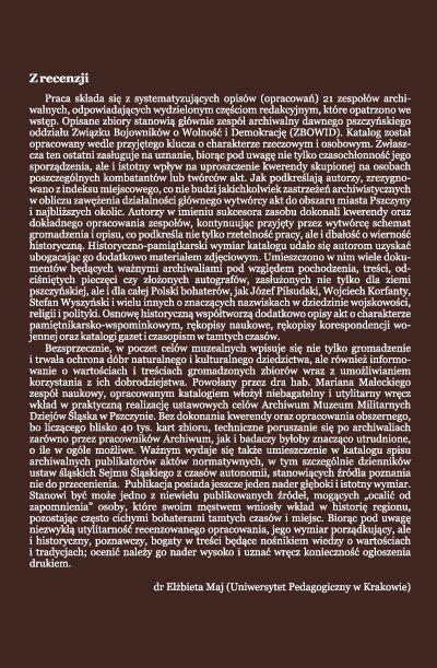 Praca składa się z systematyzujących opisów (opracowań) 21 zespołów archiwalnych, odpowiadających wydzielonym częściom redakcyjnym, które opatrzono we wstęp. Opisane zbiory stanowią głównie zespół archiwalny dawnego pszczyńskiego oddziału Związku Bojowników o Wolność i Demokrację (ZBOWID). Katalog został opracowany wedle przyjętego klucza o charakterze rzeczowym i osobowym. Zwłaszcza ten ostatni zasługuje na uznanie, biorąc pod uwagę nie tylko czasochłonność jego sporządzenia, ale i istotny wpływ na uproszczenie kwerendy skupionej na osobach poszczególnych kombatantów lub twórców akt. Jak podkreślają autorzy, zrezygnowano z indeksu miejscowego, co nie budzi jakichkolwiek zastrzeżeń archiwistycznych w obliczu zawężenia działalności głównego wytwórcy akt do obszaru miasta Pszczyny i najbliższych okolic. Autorzy w imieniu sukcesora zasobu dokonali kwerendy oraz dokładnego opracowania zespołów, kontynuując przyjęty przez wytwórcę schemat gromadzenia i opisu, co podkreśla nie tylko rzetelność pracy, alei dbałość o wierność historyczną. Historyczno-pamiątkarski wymiar katalogu udało się autorom uzyskać ubogacając go dodatkowo materiałem zdjęciowym. Umieszczono w nim wiele dokumentów będących ważnymi archiwaliami pod względem pochodzenia, treści, odciśniętych pieczęci czy złożonych autografów, zasłużonych nie tylko dla ziemi pszczyńskiej, ale i dla całej Polski bohaterów, jak Józef Piłsudski, Wojciech Korfanty, Stefan Wyszyński i wielu innych o znaczących nazwiskach w dziedzinie wojskowości, religii i polityki. Osnowę historyczną współtworzą dodatkowo opisy akt o charakterze pamiętnikarsko-wspominkowym, rękopisy naukowe, rękopisy korespondencji wojennej oraz katalogi gazet i czasopism z tamtych czasów.