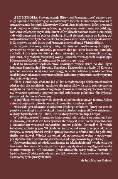 W dotychczasowej literaturze historycznej nie brakuje wspomnień i pamiętników, jednak dzieło Mieczysława Heroda jest inne. To nie wspomnienia a kalendarium wydarzeń najbardziej znanej polskiej formacji w II wojnie światowej - żołnierzy gen. Wł. Andersa. Autor opisał swoje przeżycia jako artylerzysty, w szczególności zwykłe sprawy życiowe w odniesieniu do pełnionej służby wojskowej. Wiedza na temat tak pojmowanej wojny - opisywanej praktycznie dzień po dniu nie jest znana, stąd wyjątkowość tej publikacji.