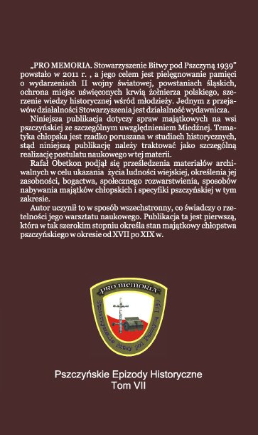 Niniejsza publikacja dotyczy spraw majątkowych na wsi pszczyńskiej ze szczególnym uwzględnieniem Miedźnej. Tematyka chłopska jest rzadko poruszana w studiach historycznych, stąd niniejszą publikację należy traktować jako szczególną realizację postulatu naukowego wtej materii.